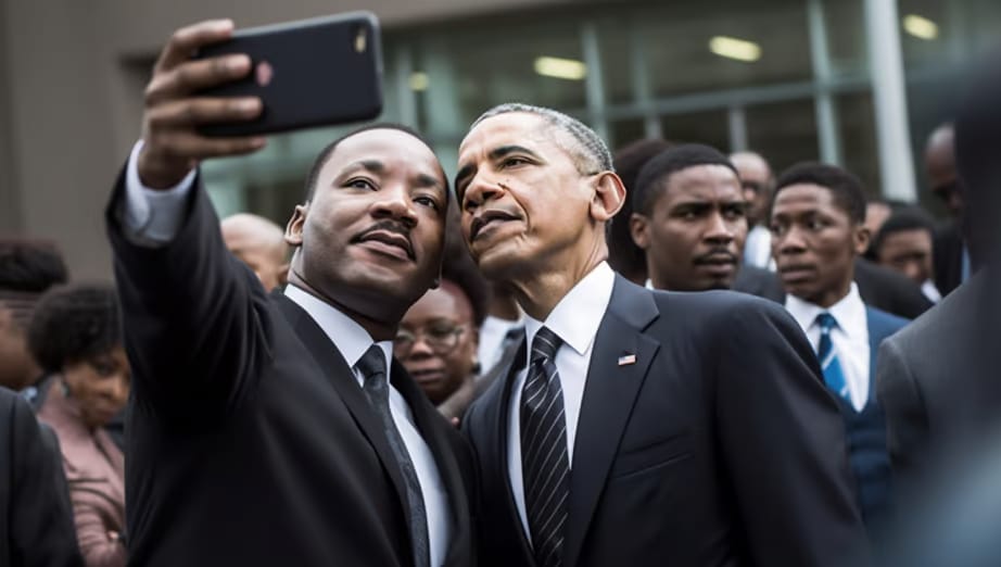 Обама робить селфі з Лінкольном і Мартіном Лютером Кінгом-молодшим. Зроблено з Midjourney.