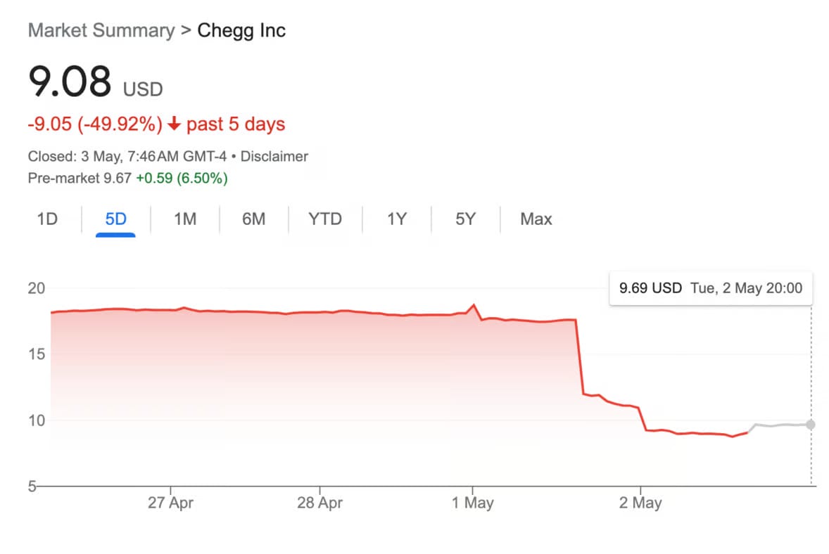 Ринкова оцінка Chegg Inc може впасти майже на 1 мільярд доларів через зростання популярності ChatGPT. Це спонукає компанію призупинити свій прогноз прибутків за весь рік. Генеральний директор Chegg Ден Розенсвейг сказав, що сплеск інтересу студентів до ChatGPT впливає на темпи зростання нових клієнтів, спричинивши падіння їхніх акцій на початку торгів у вівторок на 47%. Детальніше про це тут →